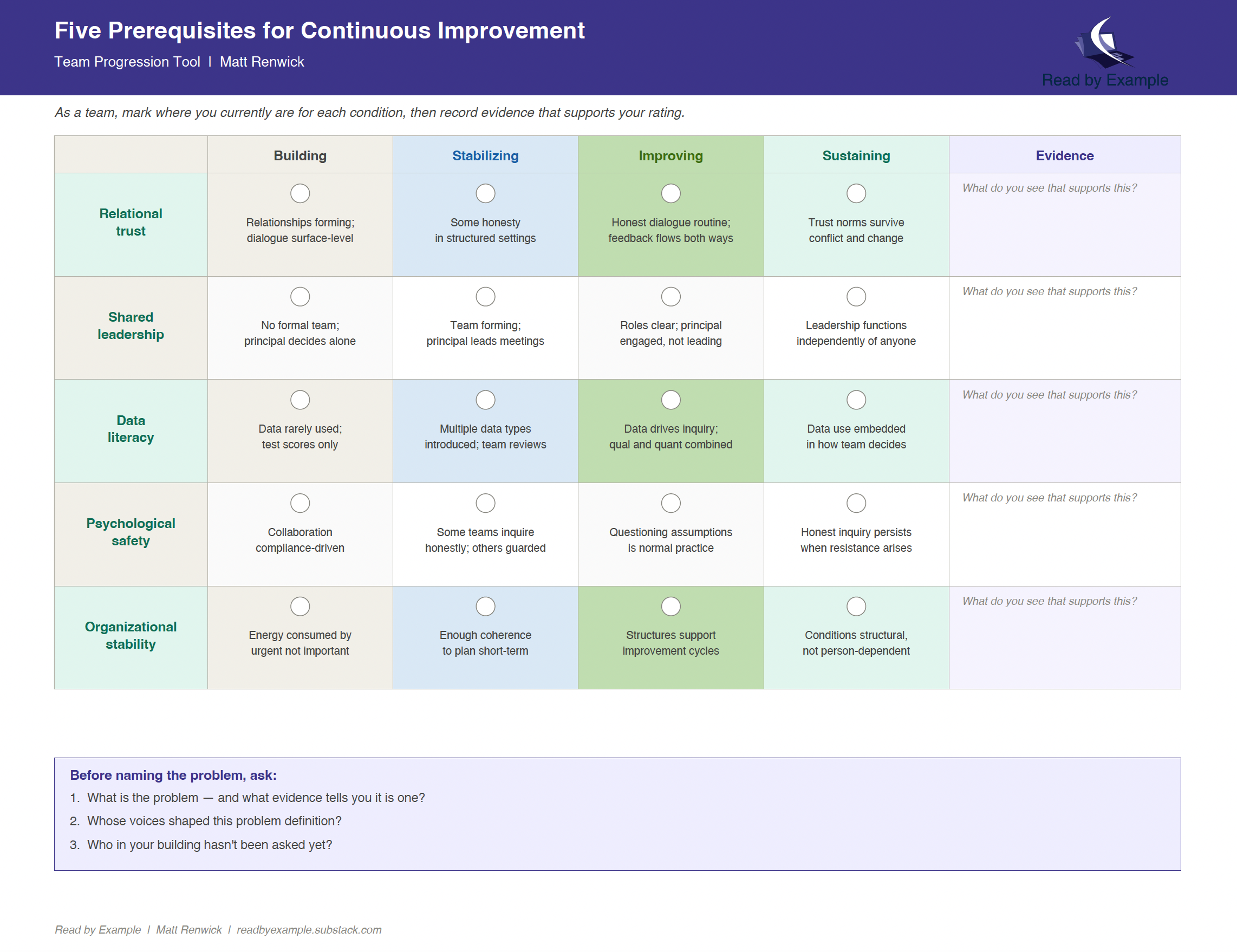 School leadership teams can use this one-page tool to assess their current conditions for supporting improvement work.